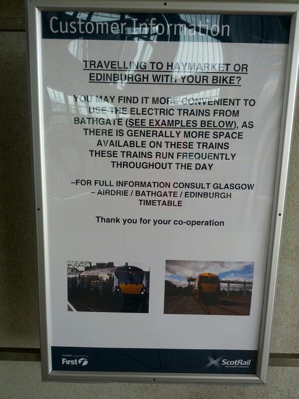 The message is targetted at the demand for the Edinburgh/Haymarket commuting journeys to Edinburgh Park where the bike becomes a key tool in making rail a popular choice for spending your resources to fund an employer's choice to move to potentially cheaper accommodation outside the city centre, and because of this you can no longer walk/cycle/get the bus to work. A similar position to the Edinburgh Royal Infirmary where a sustainable transport profile with around 90% of staff, clients and visitors travelling on foot, bus or bike at the old site was blown away and the figures practically inverted with those for journeys made (often alone) in a car.