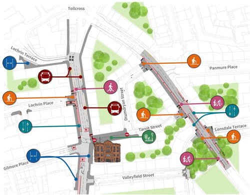 - Contraflow cycling allowed on Valleyfield Street and Glengyle Terrace