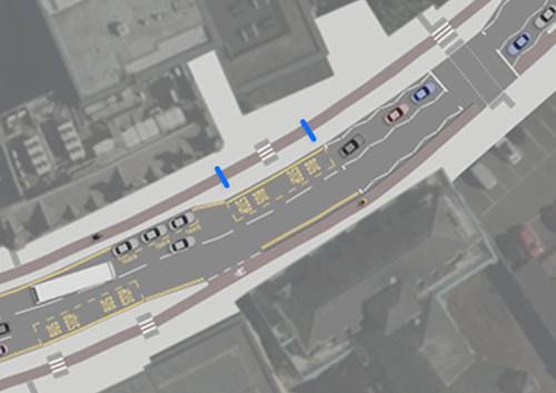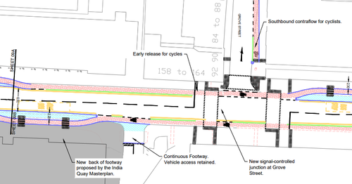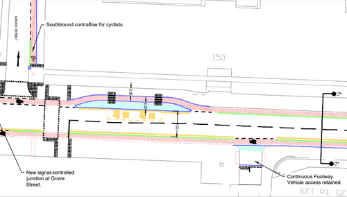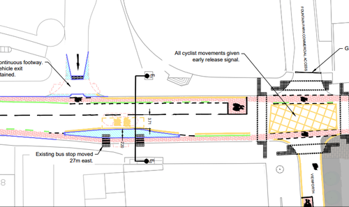 Stop 9 (Eastbound, also pictured in the above) has a 2.2m island space twice the length of the marked stopping area for the bus on the carriageway, with a single zebra at the stop and a second zebra facilitating the connected pedestrian crossing at its eastern end. I'd actually like to see two zebra crossings here matching the rest of the scheme, at the blue markings below - as these match up with my expectation that buses serving the stop need a crossing at the driver's end for folks disembarking and catching it last-minute from the footway (yes, I acknowledge this scenario can actually happen and could mean an interaction with a cyclist, big gasp) and also a crossing at the other end, where assumedly the end of any queue for the bus would be.