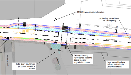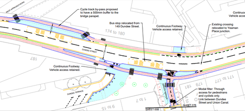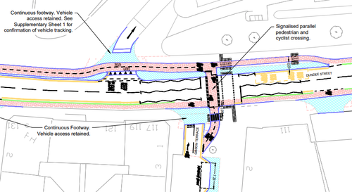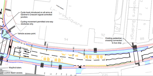 Stop 8 (Westbound) is significant in its island length (which runs all the way to the CYCLOPS junction at Lochrin basin), is again at a width of 2.2m, with two zebra crossings as per most of the bus stops in the scheme;